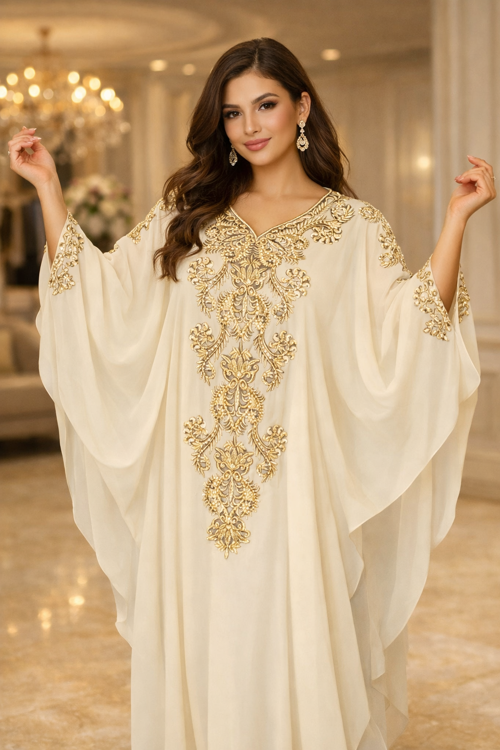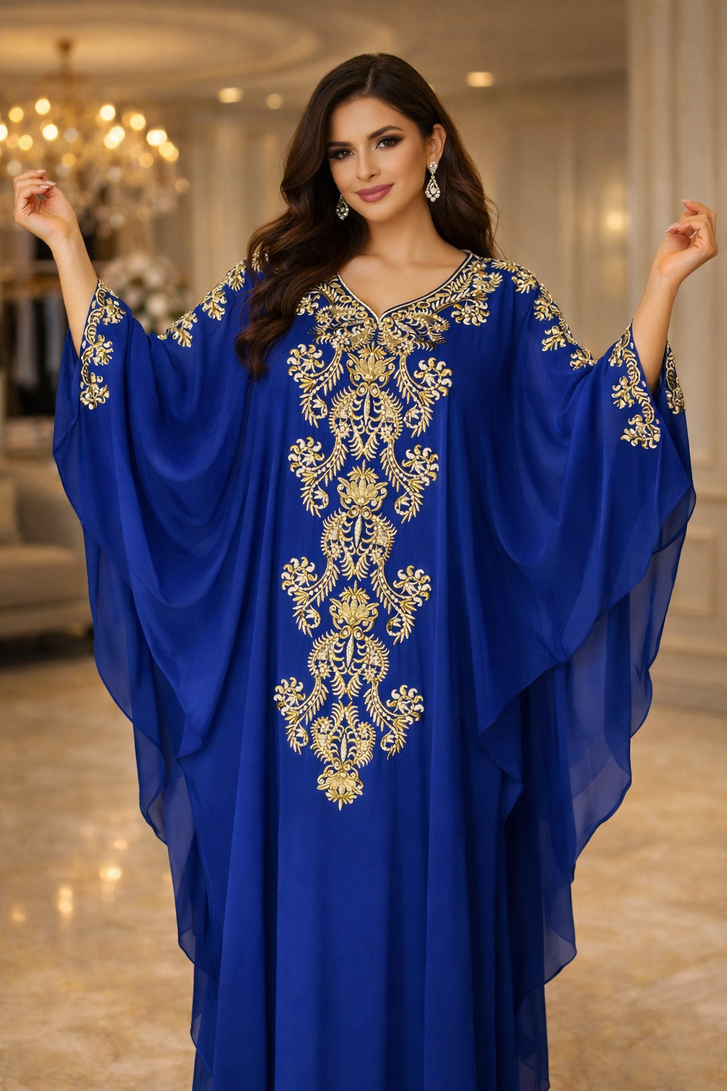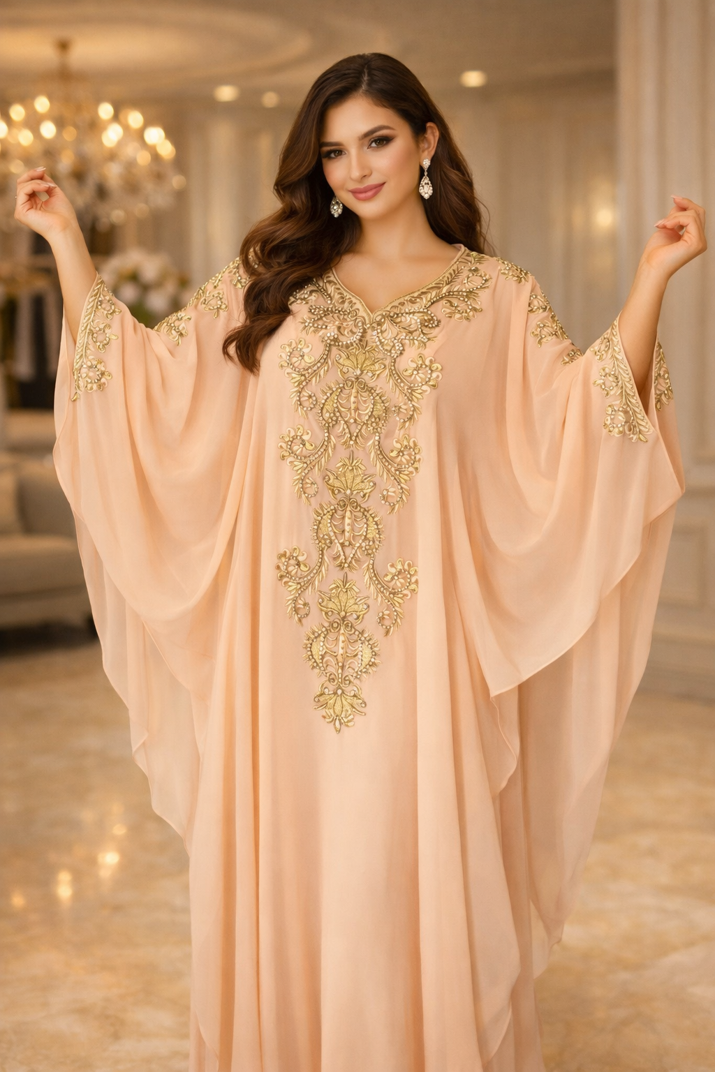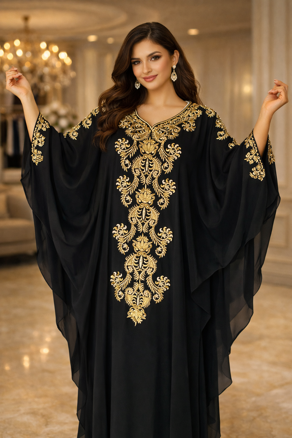 Mit ihren kunstvollen goldenen Stickereien und den weiten, eleganten Ärmeln verleiht diese Abaya jeder Trägerin eine königliche Ausstrahlung perfekt für besondere Anlässe, Feiern oder elegante Abendveranstaltungen.